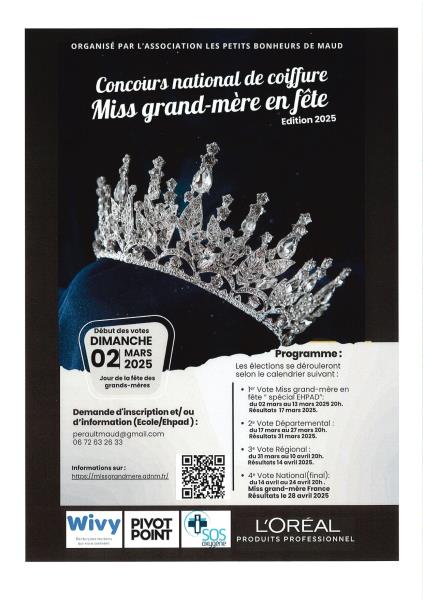 Je suis ravie de vous annoncer la candidature de 5 résidentes de la résidence Les Amandines au concours national "Miss Grand-mère en fête" pour l'année 2025, qui met en concurence les résidentes d'EHPAD de toute la France.