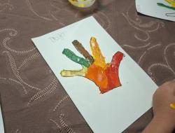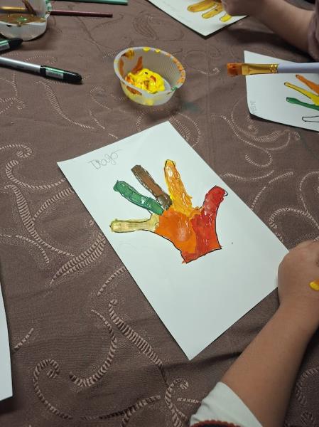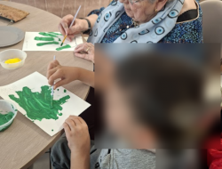 Chaque participant, résident et enfant, a laissé son empreinte de main sur de grandes feuilles de papier, qu’il a ensuite peintes et décorées selon son inspiration. Ces empreintes, assemblées ensuite, formeront le feuillage d’un grand arbre coloré, symbole de solidarité, de transmission et d’amitié entre les générations.