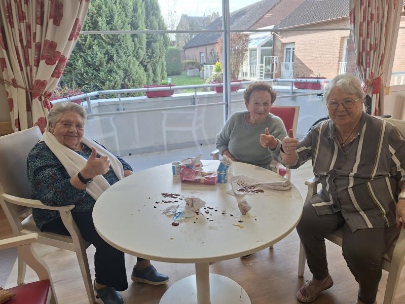 L’atelier a été rythmé par les rires, les échanges et une belle complicité entre les enfants et les résidents. Pour clôturer cette matinée riche en émotions, tout le monde s’est réuni autour d’un goûter gourmand, préparé avec soin par nos résidentes cuisinières : un délicieux marbré au chocolat, réalisé le matin même.